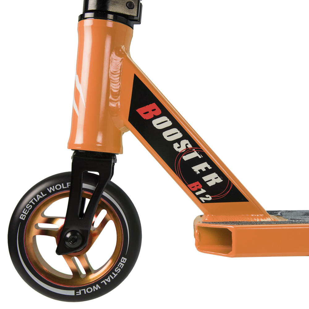 El nuevo Scooter Pro Booster B12 incluye dirección integrada, nueva tabla de aluminio más larga, horquilla con sistema que facilita exponencialmente el mantenimiento del patinete (sistema IHC), manillar altamente resistente, fabricado en Chromoly y más grande que en la versión anterior, y ruedas de aluminio de 110mm con nuevo diseño del core.